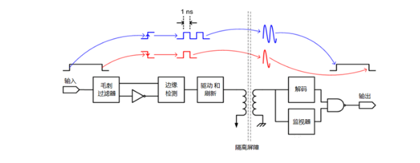 數(shù)字隔離器有較快速的傳輸響應(yīng),可以利用編碼來表達(dá)邏輯高電平和邏輯低電平,以下圖為例: